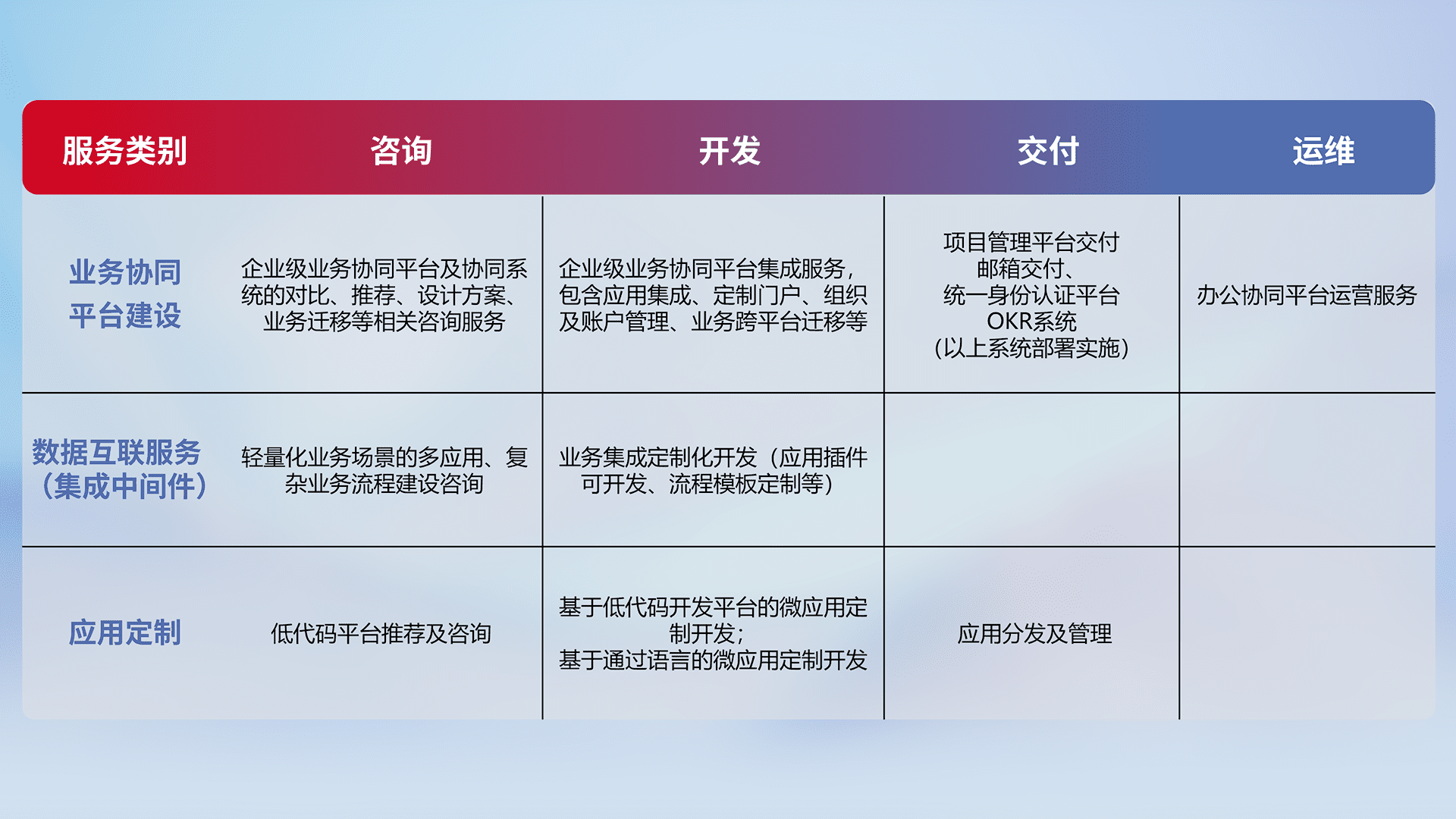 针对钉钉、、企微、、、IDaas等平台级产品提供产品的规划、、、、方案、、、交付、、、定制化开发等服务,,,,实现如统一协同办公、、、、智能客户服务、、混合会议管理、、智能数据查询、、、等业务场景,,,,实现数字化转型。。。